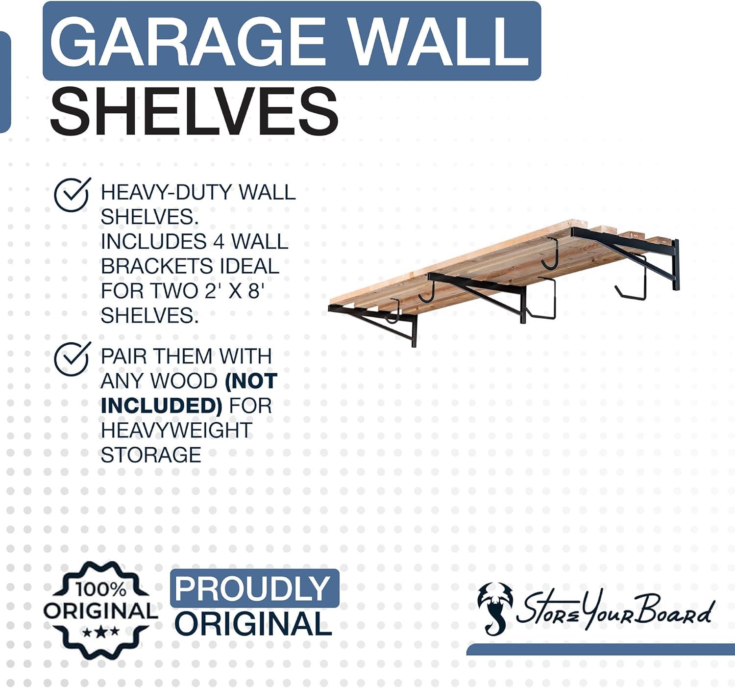 imageStoreYourBoard 24 Inch Heavy Duty Shelf Brackets Set of 3 for 2 x 8 DIY Garage Wall Shelf Holds 450 lbs Solid Steel Includes 5 Hooks for Hanging Storage 2375quot x 1quot x 95quot 3Pack2 x 4