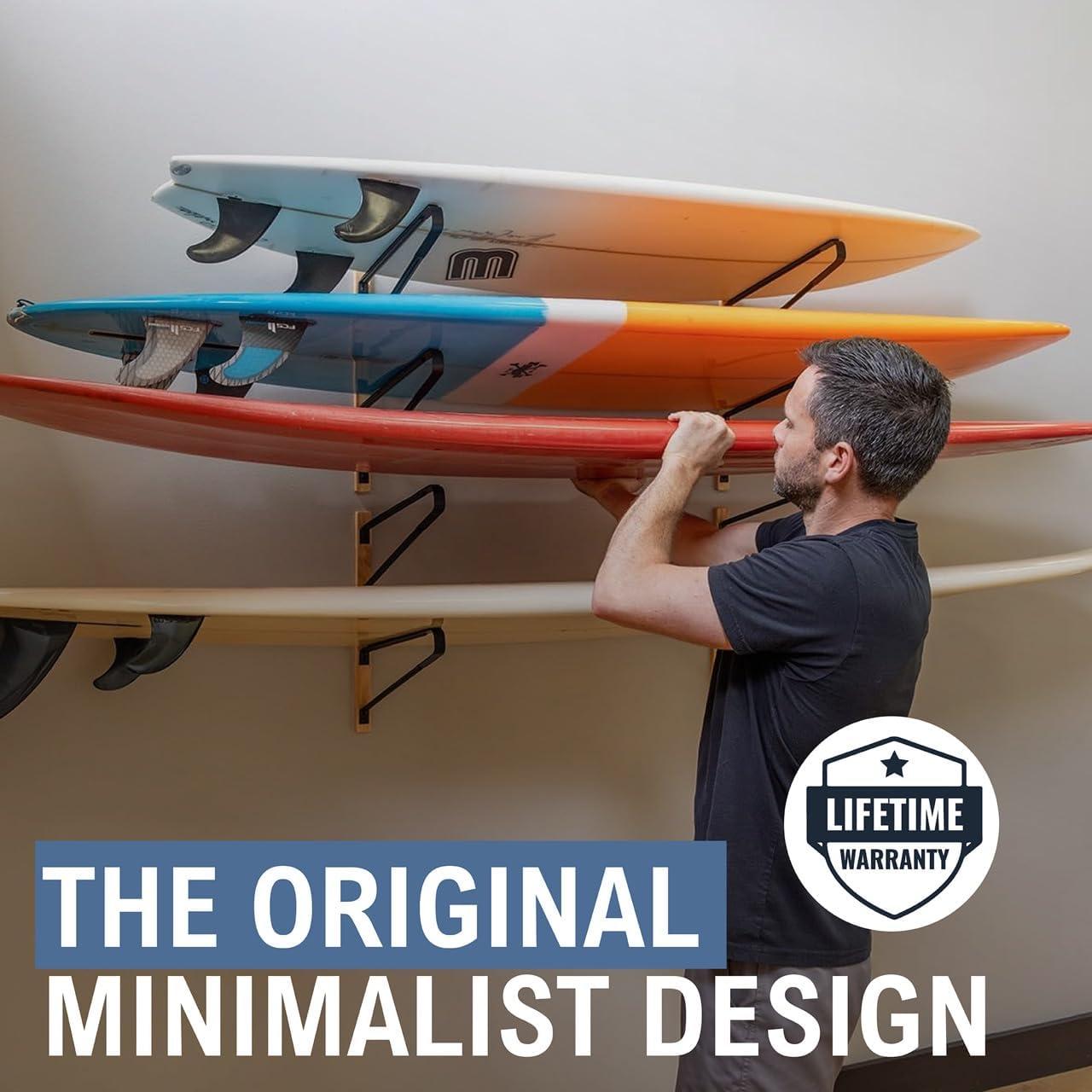 StoreYourBoard Avon Surf Board Rack, 2 Surfboard Wall Decor Mount for Shortboards and Longboards, Natural Wood and Solid Steel(4 Levels)