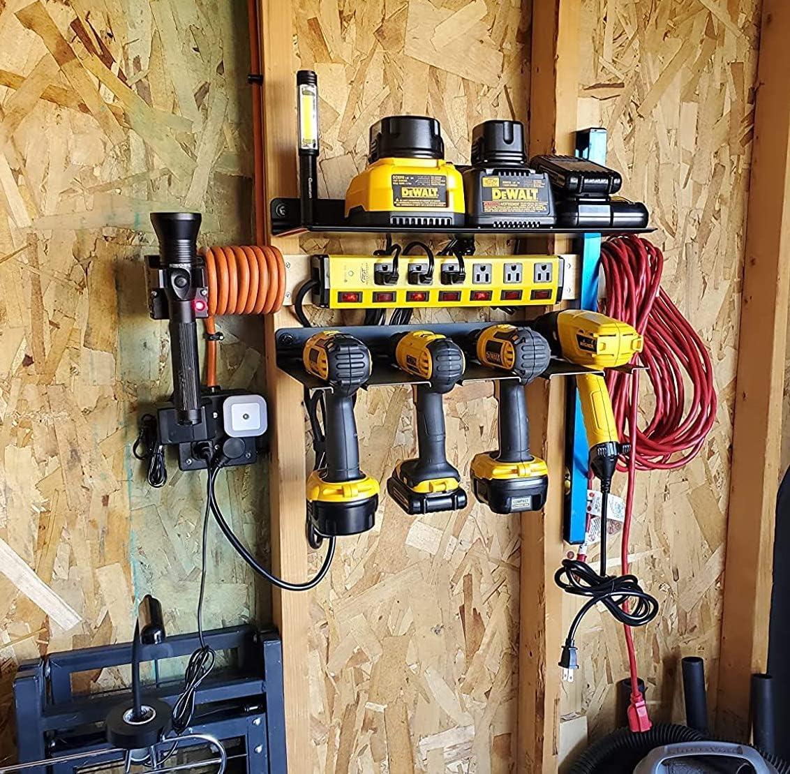 ORGANIZE YOUR WORKBENCH: Wall-mounted storage for up to 4 cordless drills, impact drivers, or hammer drills.