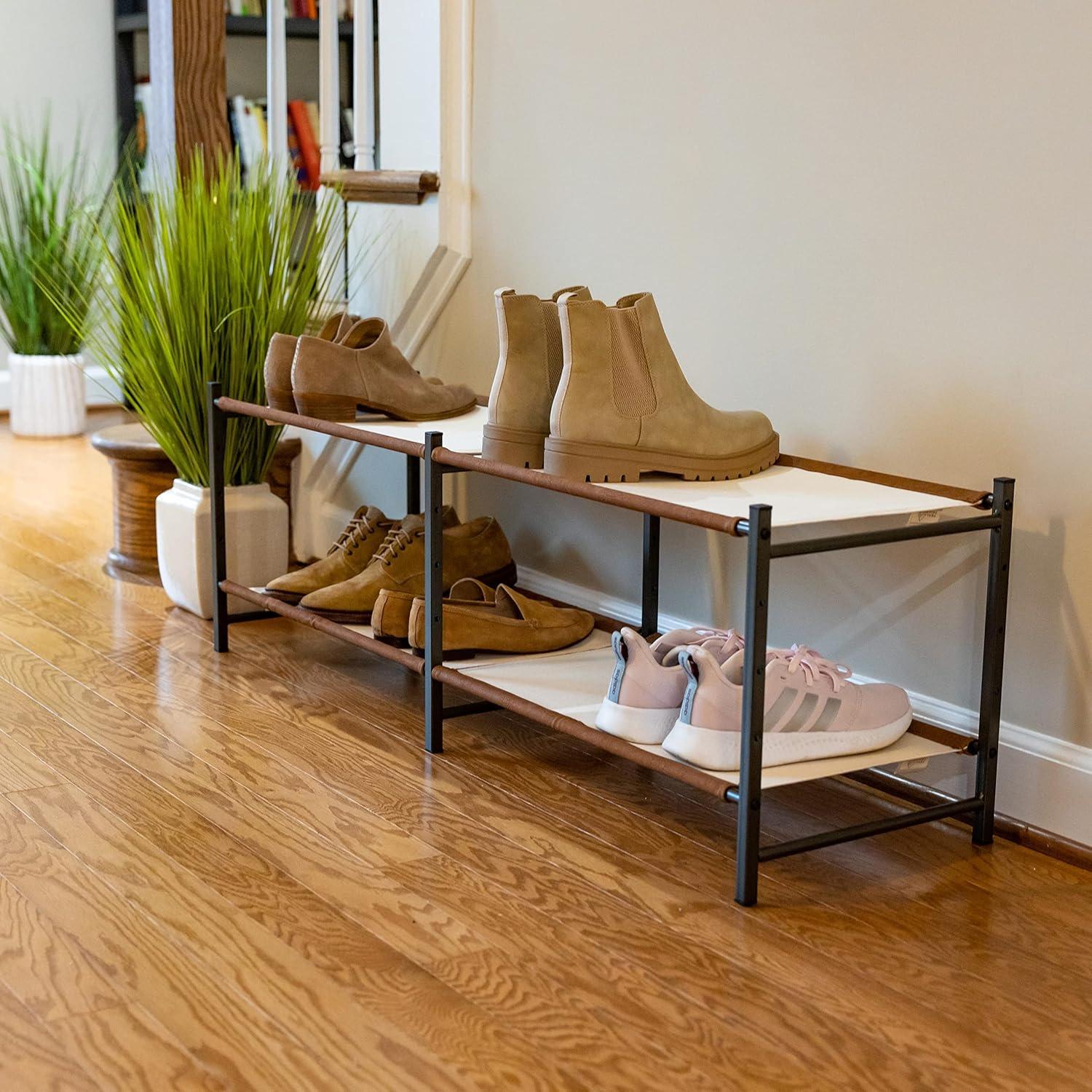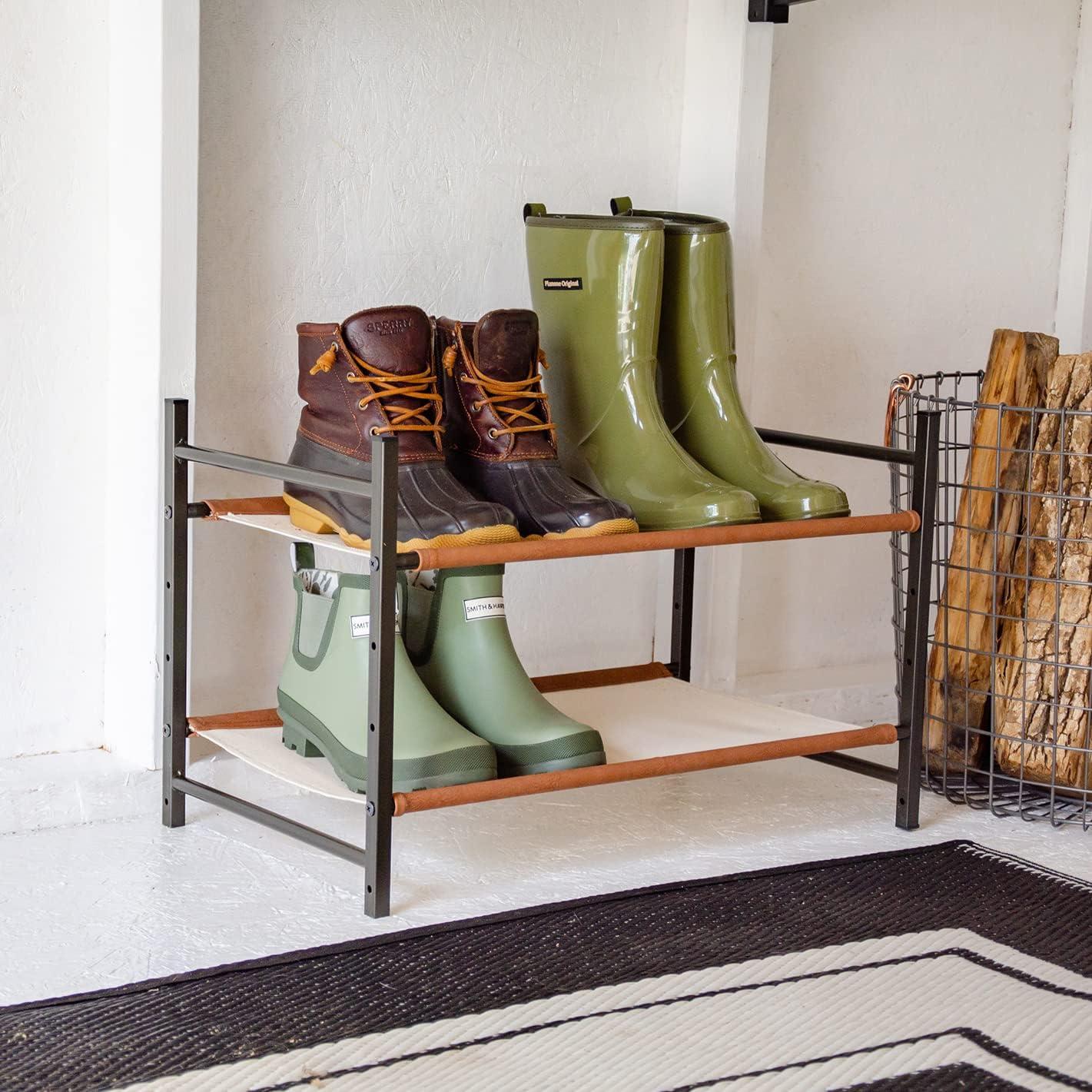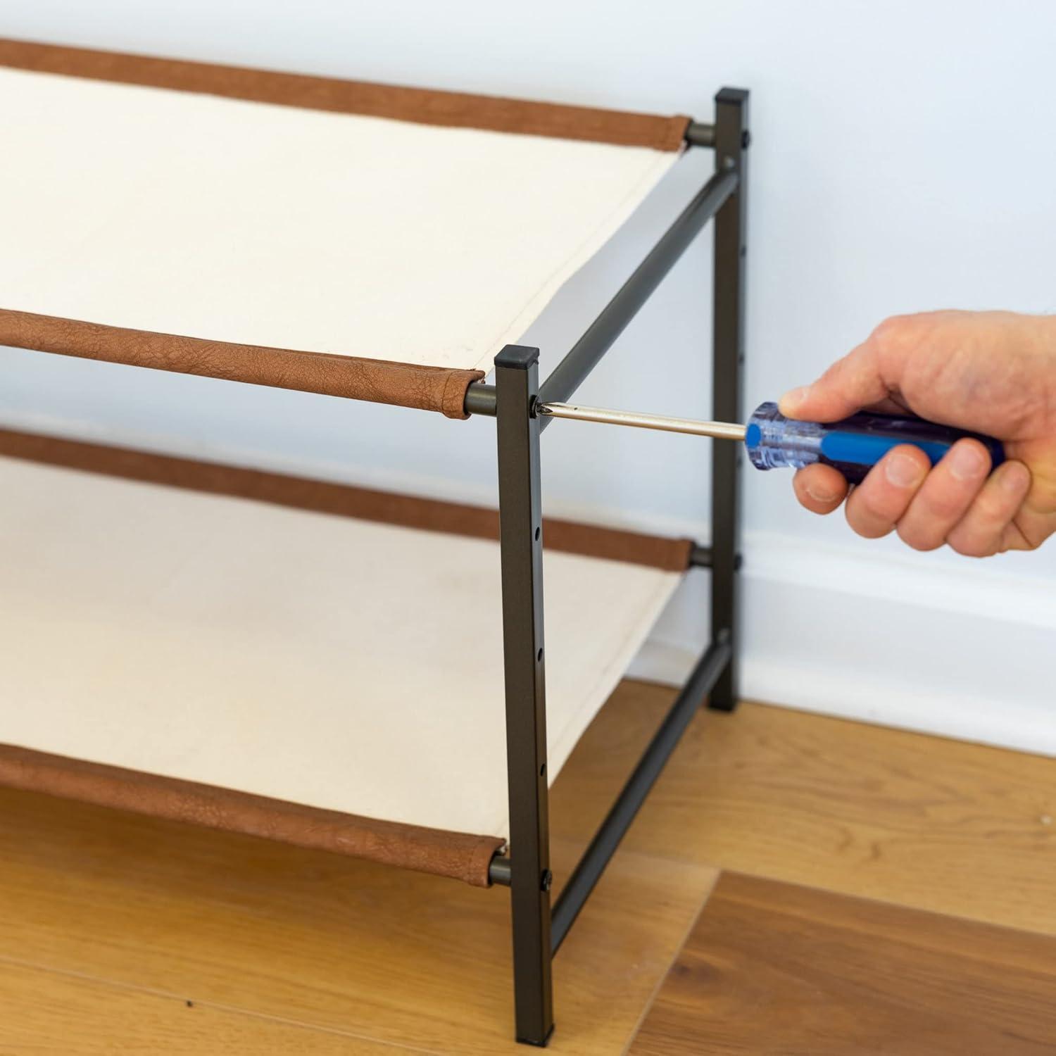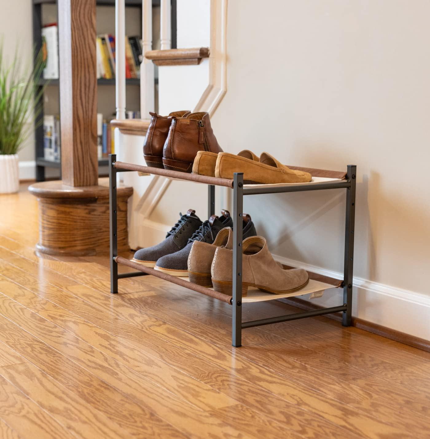 The Aspen Shoe Rack combines style with strength for organized indoor shoe storage. Durable canvas shelves and rigid alloy steel frame support up to 40 lbs for a rock-solid furniture piece. Adjustable levels allow you to build the rack to fit the size of your shoes or utilize the floor for extra storage under the rack. Quality, easy-to-assemble components arrive in thoughtful packaging and only require a Phillips head screwdriver for assembly. Clear up space in your entryway, mudroom, garage, kitchen, hallway, apartment, or garage with this high-end shoe organizer!