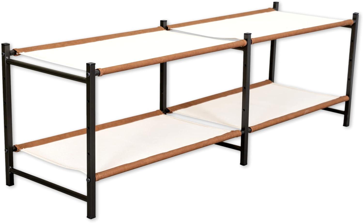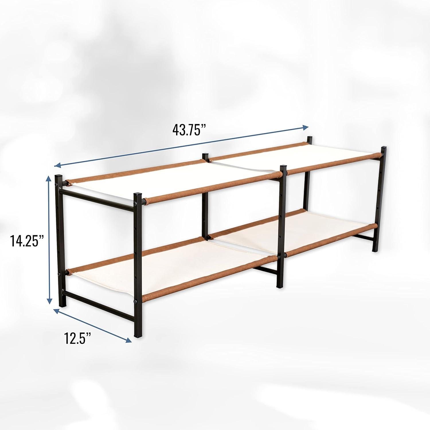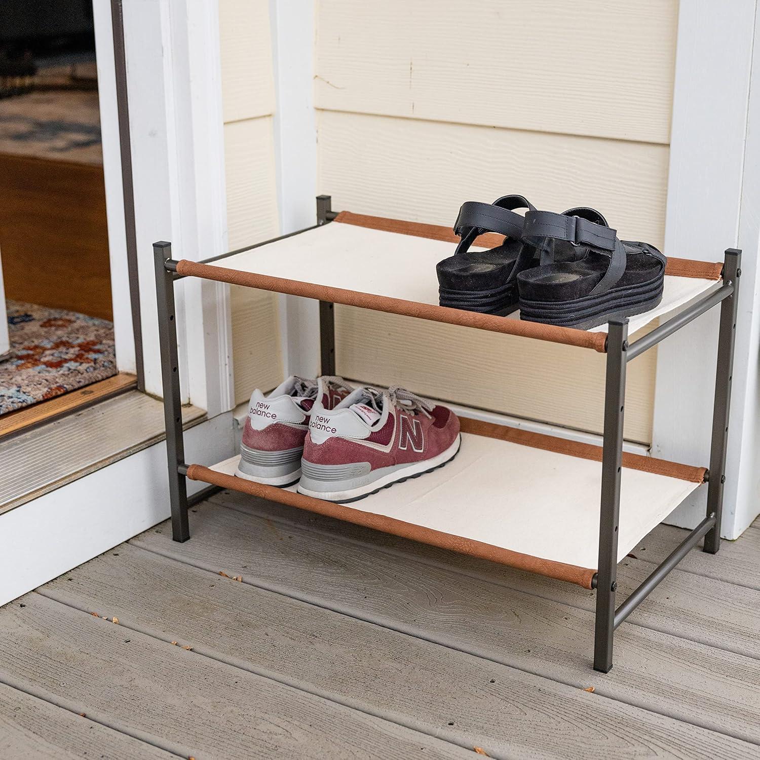 The Aspen Shoe Rack combines style with strength for organized indoor shoe storage. Durable canvas shelves and rigid alloy steel frame support up to 40 lbs for a rock-solid furniture piece. Adjustable levels allow you to build the rack to fit the size of your shoes or utilize the floor for extra storage under the rack. Quality, easy-to-assemble components arrive in thoughtful packaging and only require a Phillips head screwdriver for assembly. Clear up space in your entryway, mudroom, garage, kitchen, hallway, apartment, or garage with this high-end shoe organizer!