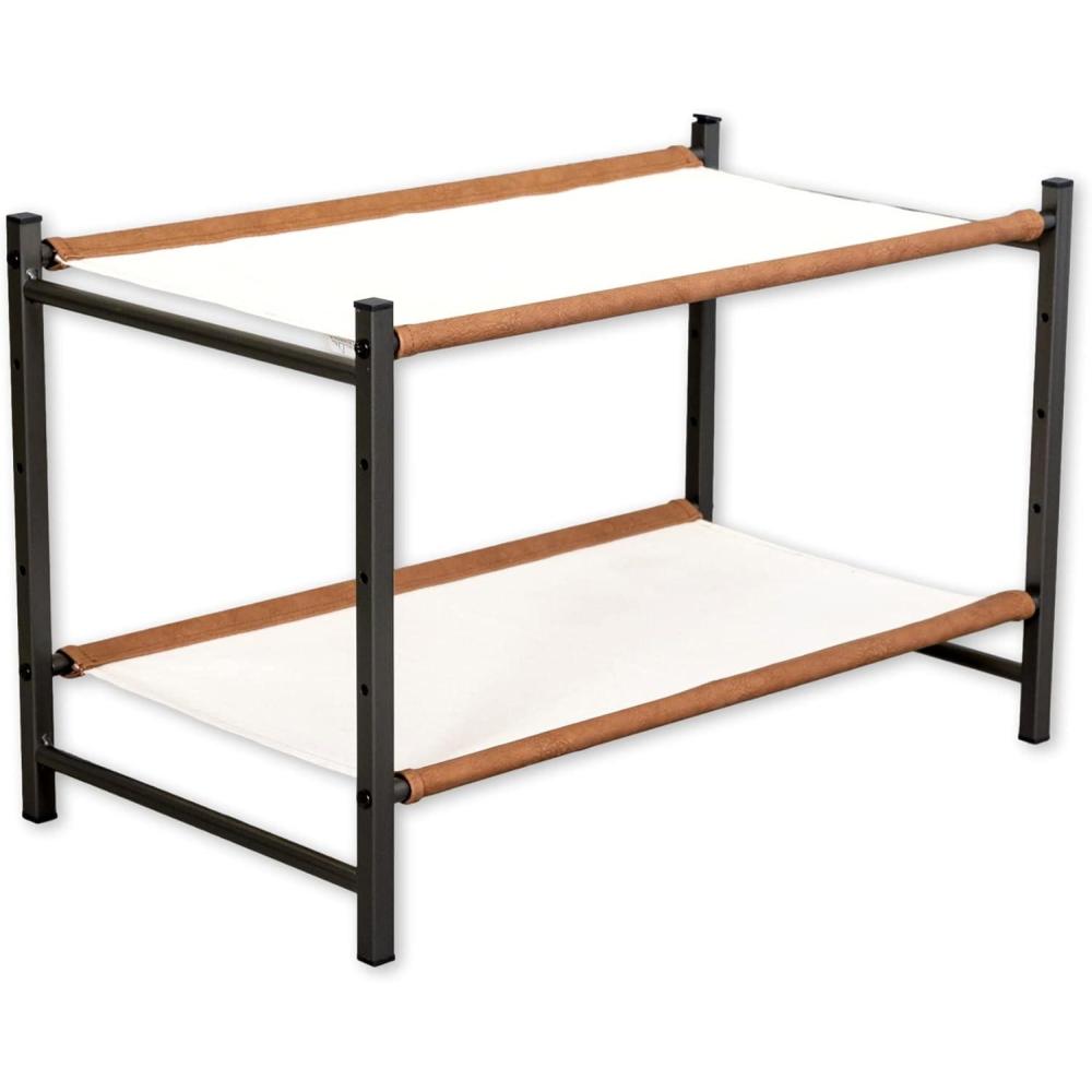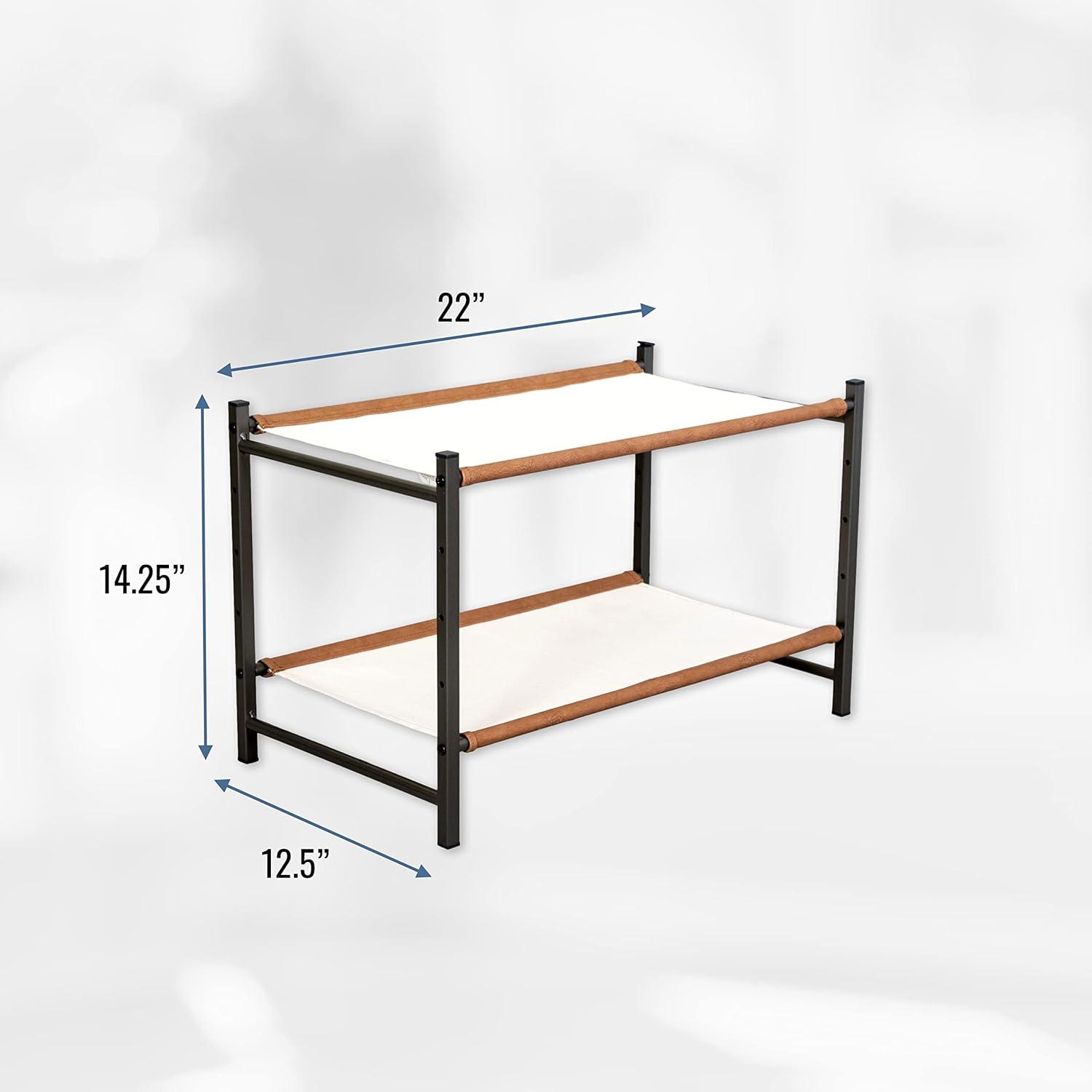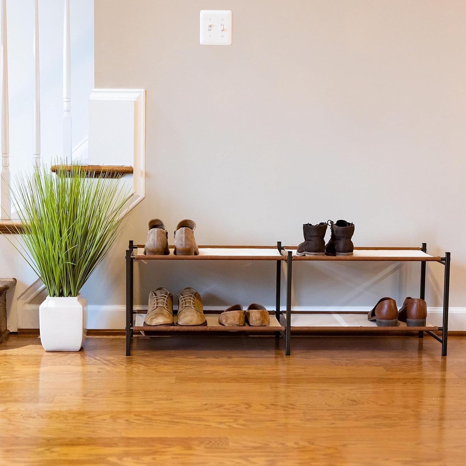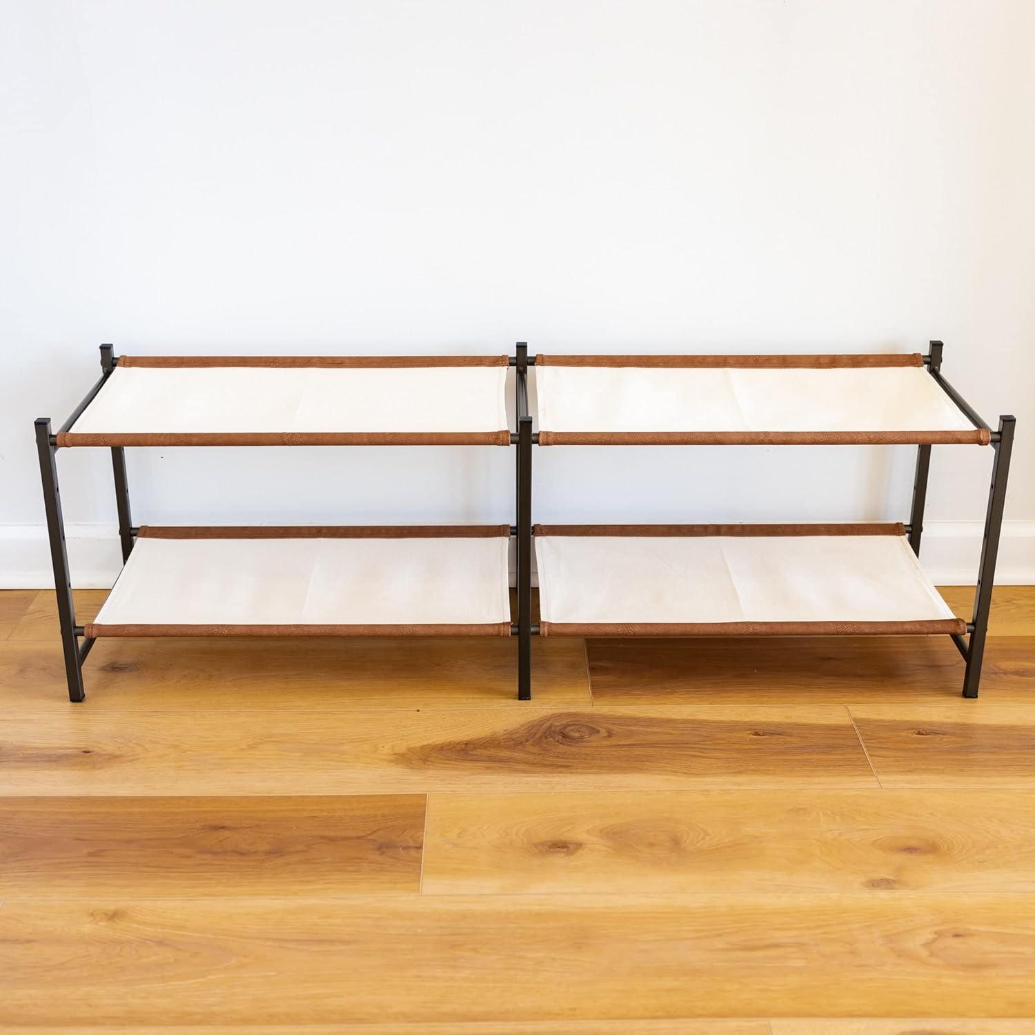 The Aspen Shoe Rack combines style with strength for organized indoor shoe storage. Durable canvas shelves and rigid alloy steel frame support up to 40 lbs for a rock-solid furniture piece. Adjustable levels allow you to build the rack to fit the size of your shoes or utilize the floor for extra storage under the rack. Quality, easy-to-assemble components arrive in thoughtful packaging and only require a Phillips head screwdriver for assembly. Clear up space in your entryway, mudroom, garage, kitchen, hallway, apartment, or garage with this high-end shoe organizer!